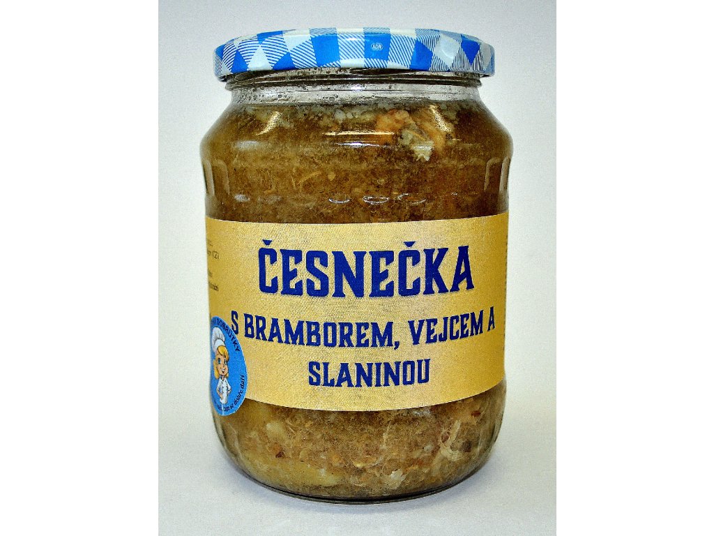 Složení: Hovězí vývar 75 % (pitná voda 80 %, morkové kosti 5 %, hovězí žebro 5 % %, kořenová zelenina 8 %, koření do 2 % - libeček, celý pepř, česnek, cibule, nové koření, bobkový list, sůl), brambory 14 %, cibule 4 %, anglická slanina 4 %, česnek 1,5 %, vepřové sádlo 1 %, koření – majoránka, sůl a pepř do 1 %.