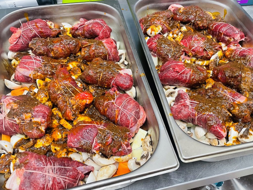 Složení: hovězí zadní s výpekem 30 %, žampiony 12 %, cibule 10 %, mrkev 10 %, celer 10 %, petržel 7 %, anglická slanina 6 %, vejce 5 %, sterilované okurky 5 %, jemné párky 4 %, koření – sůl, pepř mletý do 1 %.