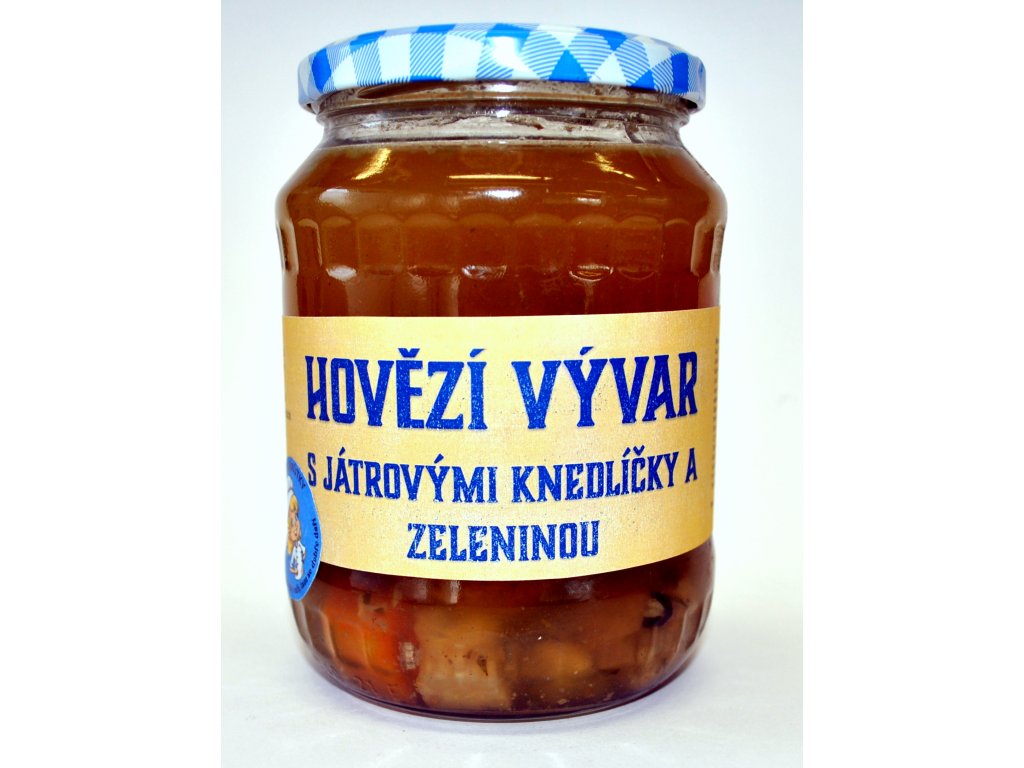 Složení: Hovězí vývar 73 % (pitná voda 80 %, morkové kosti 5 %, hovězí žebro 5 % %, kořenová zelenina 8 %, koření do 2 % - libeček, celý pepř, česnek, cibule, nové koření, bobkový list, sůl), játrové knedlíčky 15 % (hovězí játra 70 %, strouhánka 25 %, vejce 3 %, česnek, majoránka, libeček, sůl, pepř – koření do 2 %), kořenová zelenina vařená 10 %, sůl a pepř do 2 %.