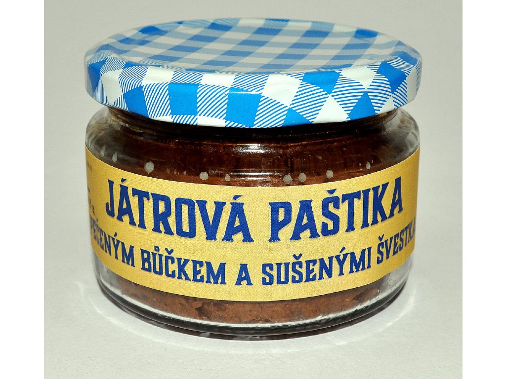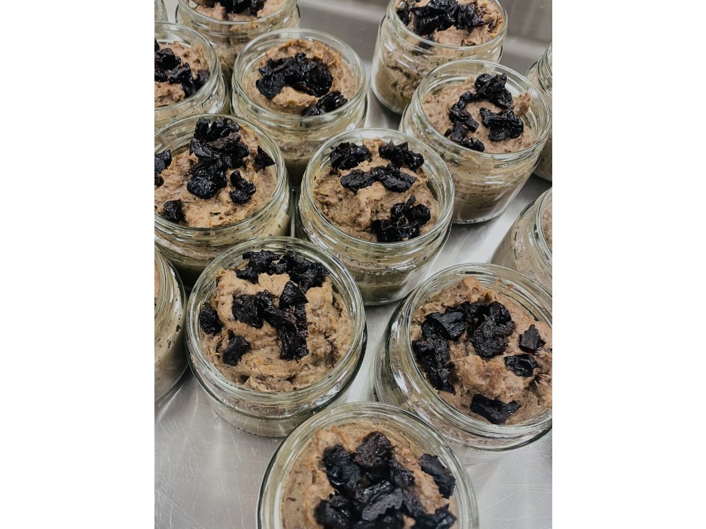 Složení: Vepřový bok pečený 33 %, kuřecí játra podušená 31 %, červené víno 11 %, cibule 10 %, sušené švestky 8 %, máslo 5 %, česnek do 0,5 %, čerstvé byliny (tymián, rozmarýn) do 0,5 %, koňak do 0,5 %, koření – sůl, kmín celý, majoránka do 1 %.