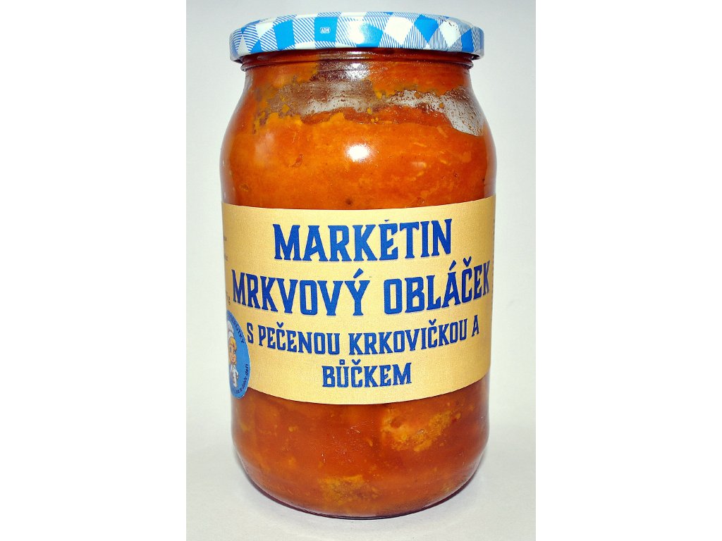 Složení: Mrkev 38 %, Hovězí vývar 28 % (pitná voda 80 %, morkové kosti 5 %, hovězí žebro 5 % %, kořenová zelenina 8 %, koření do 2 % - libeček, celý pepř, česnek, cibule, nové koření, bobkový list, sůl), vepřová krkovice 15 %, vepřový bok pečený 12 %, cibule 5 %, máslo 1 %, koření – sůl, kari, kmín celý, muškátový ořech do 1 %.