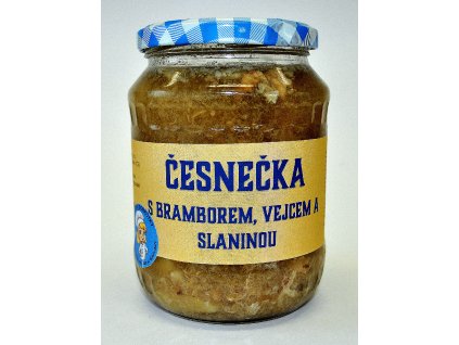 Vydatná a hustá česnečka z vývaru s uzenou slaninou, bramborami a rozšlehanými vejci. Kdo má česnečku rád, na naší si určitě pochutná.